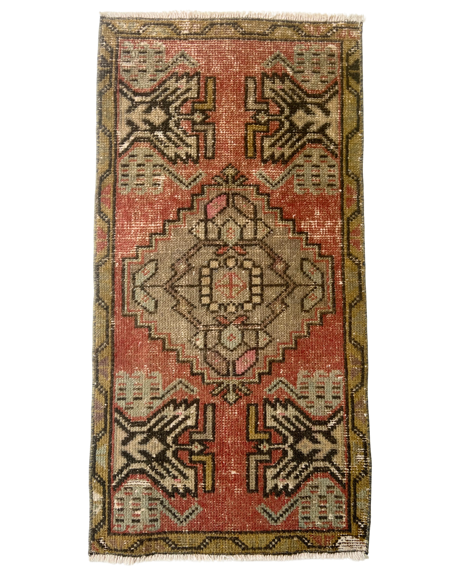 The Anya vintage mini rug is a bold and beautifully detailed Turkish scatter rug featuring a strong central geometric medallion surrounded by striking tribal motifs. The rich terracotta field is contrasted with earthy olive, soft beige and deep charcoal tones, creating a warm and characterful palette. Angular corner motifs and a defined border frame the design, giving the rug a balanced, symmetrical feel. The naturally distressed finish softens the colours and enhances its authentic vintage charm, making it a standout piece despite its compact size.