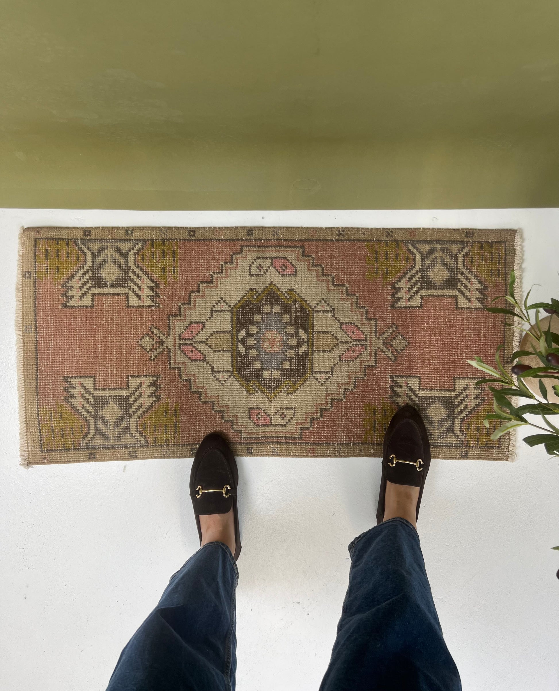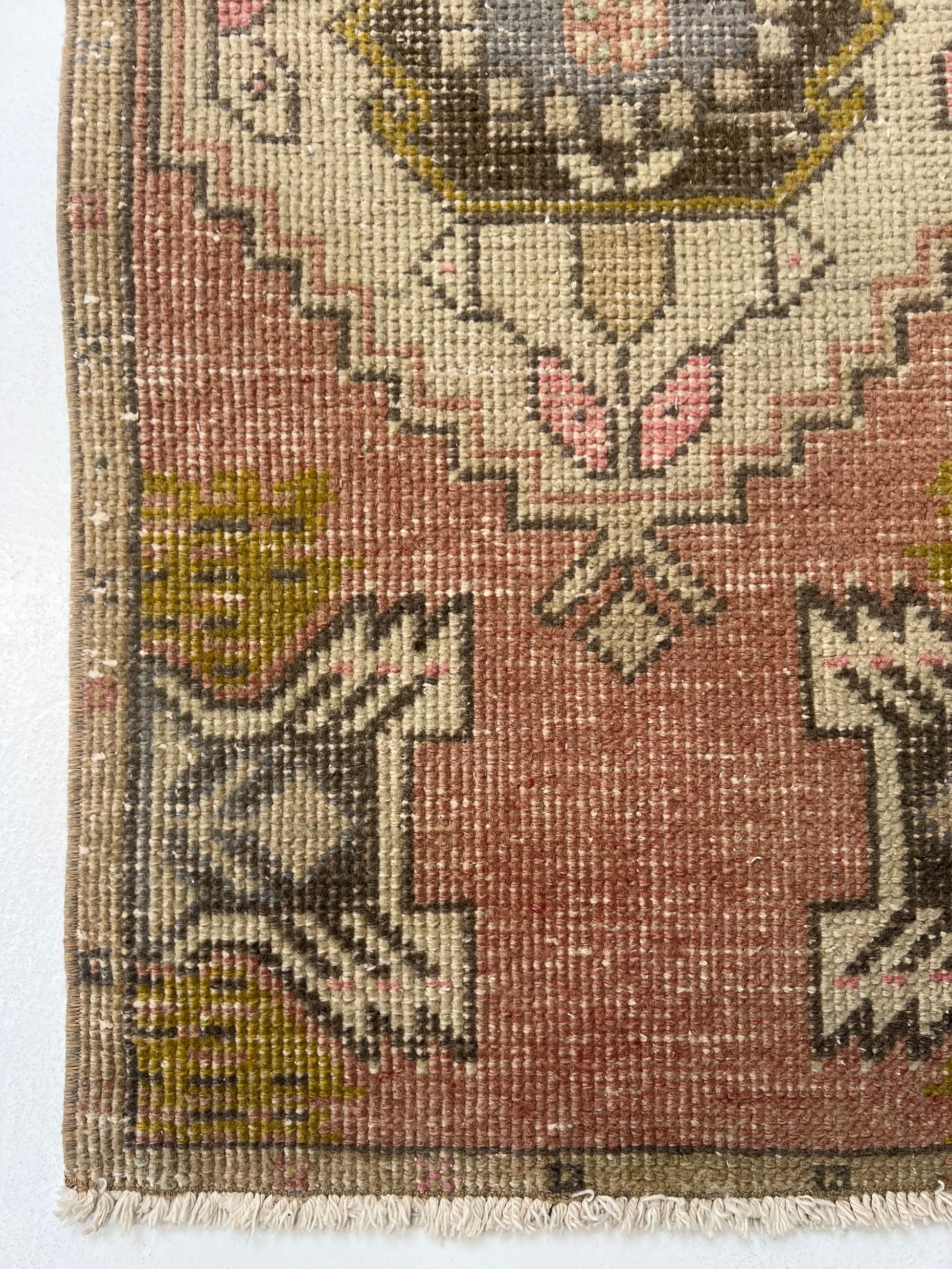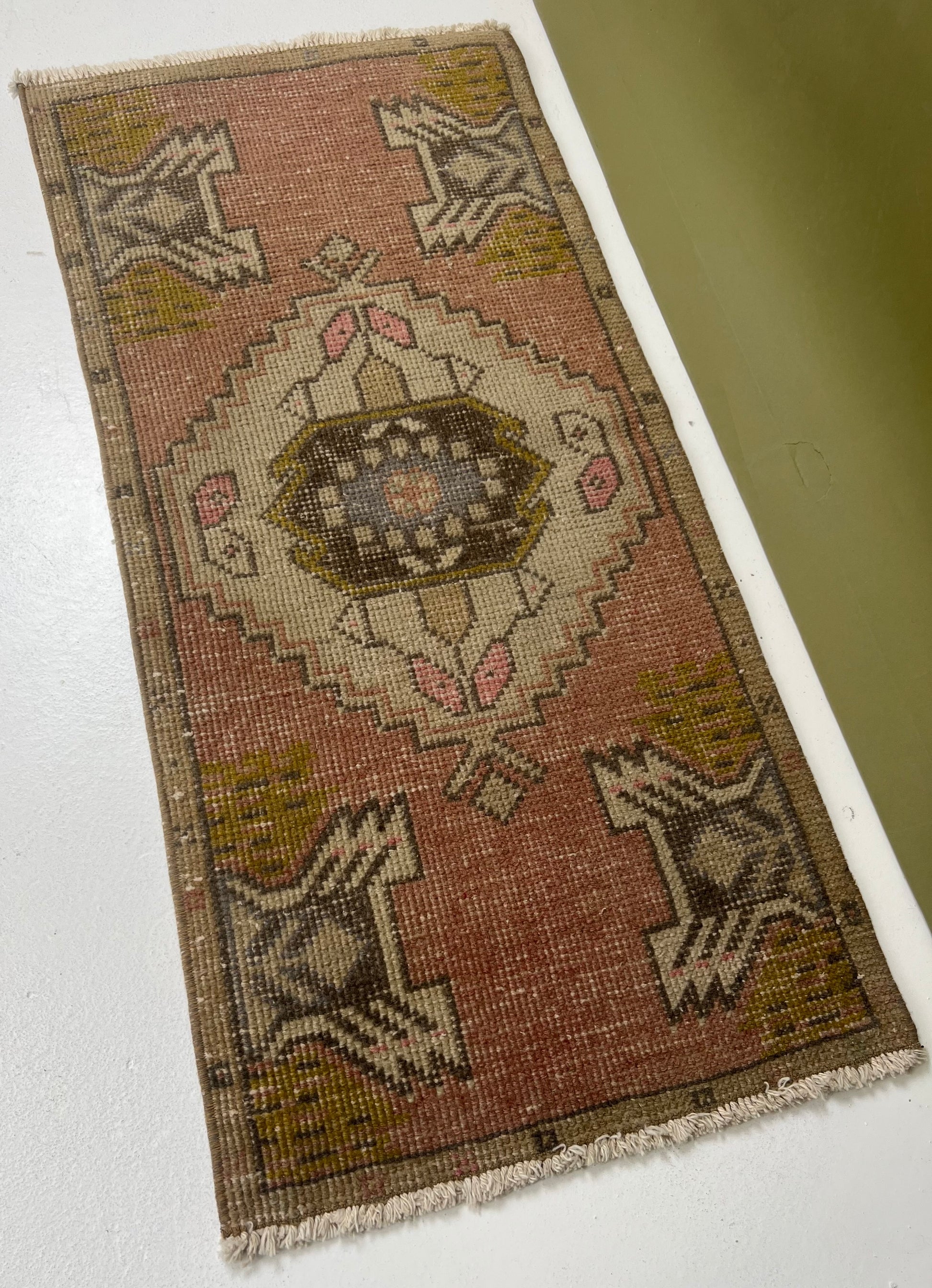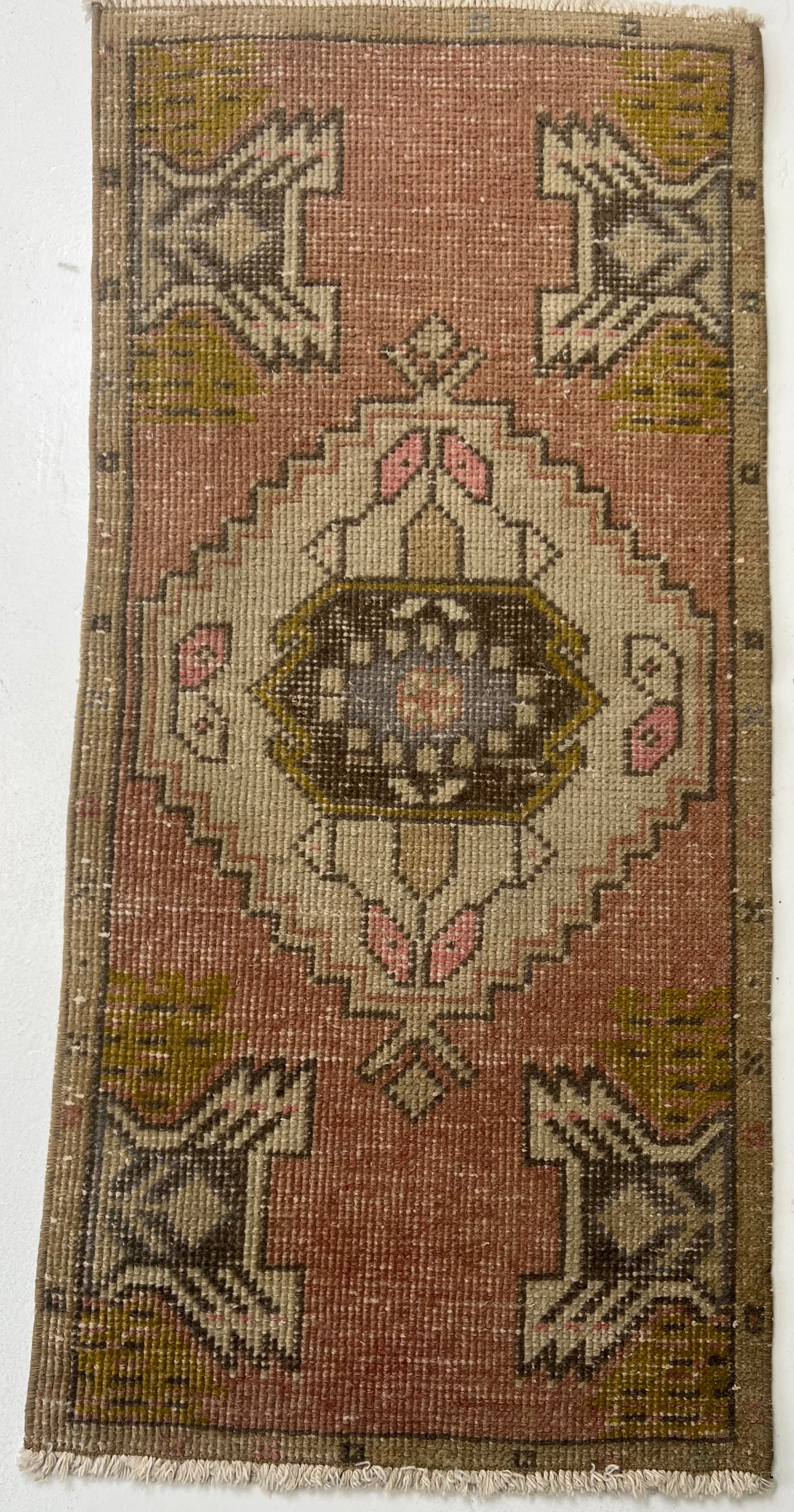This is a one-of-a-kind, handmade vintage mini rug – only one available.