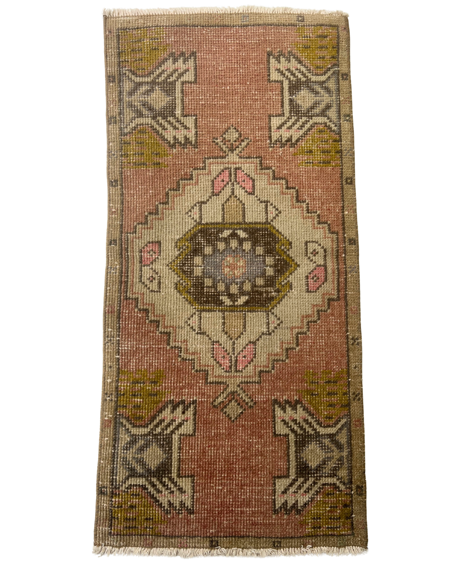 The Ashe vintage mini rug is a beautifully balanced Turkish scatter rug featuring a soft geometric central medallion framed by bold, angular tribal motifs. The warm terracotta field is gently muted with tones of soft ivory, faded charcoal, and earthy mustard, while subtle hints of blush pink and dusty blue add depth and interest. The symmetrical layout gives a strong sense of structure, while the naturally worn finish softens the contrasts, creating a relaxed, timeworn aesthetic. Compact yet full of character, this rug is ideal for adding warmth and personality to smaller spaces.