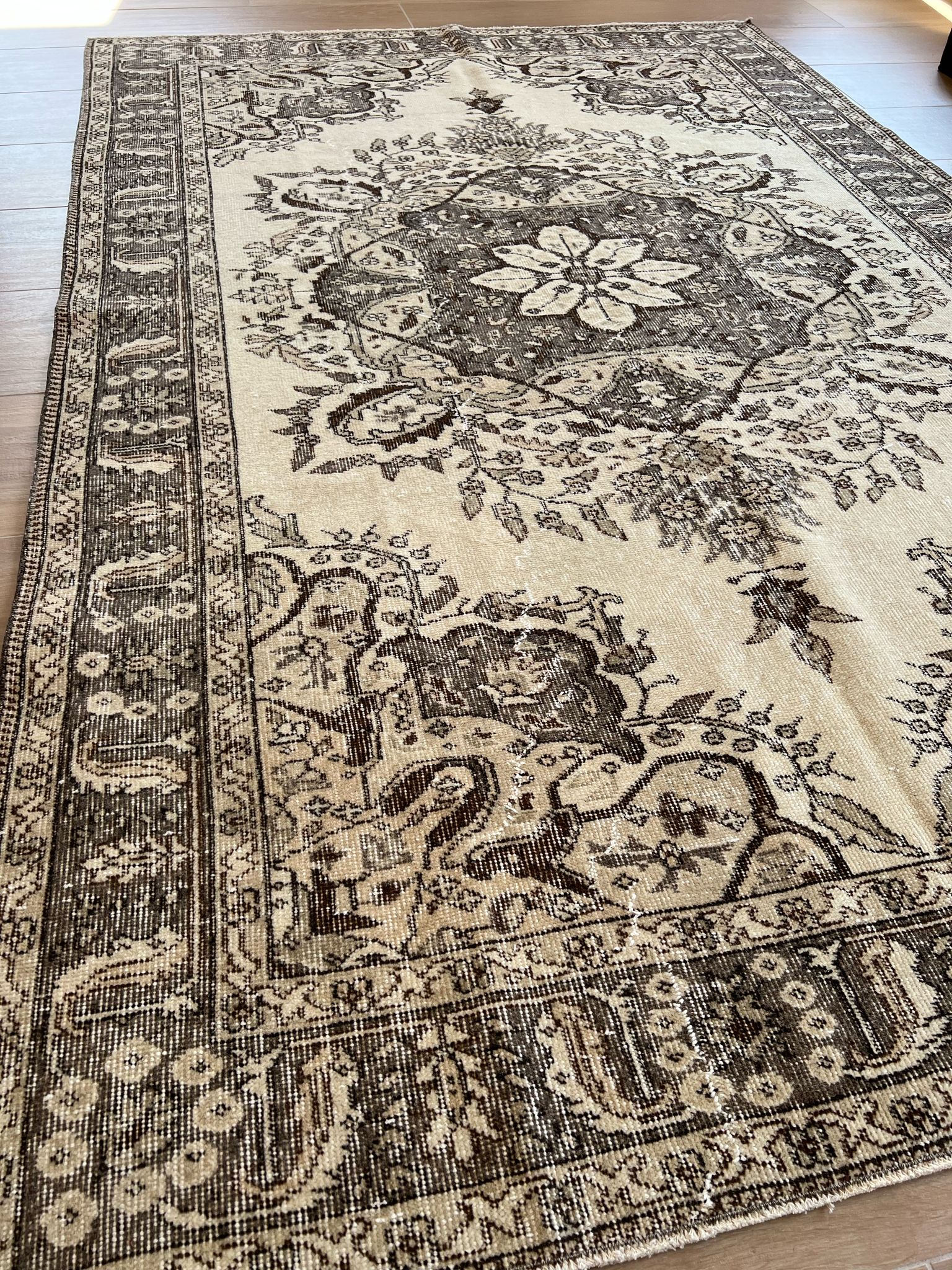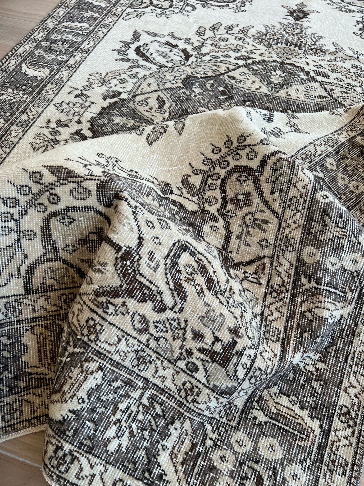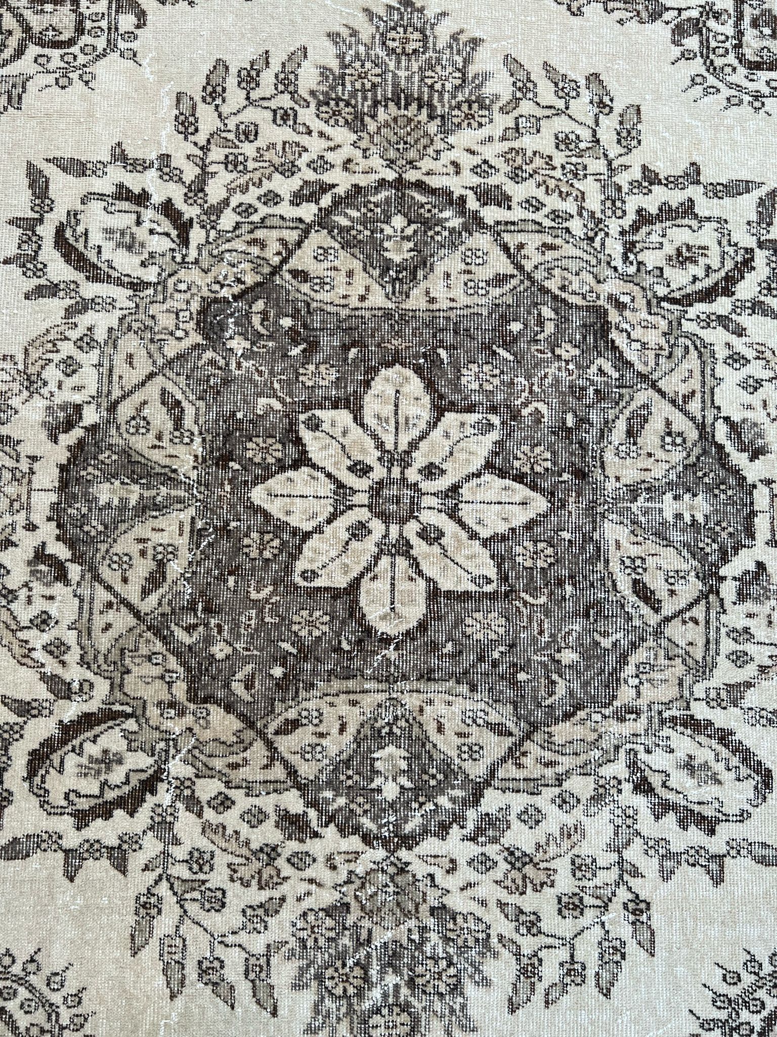 The Aubrey vintage rug is a stunning example of classic Turkish design, featuring a beautifully intricate central medallion motif framed by symmetrical floral and vine detailing. The distressed beige and deep charcoal hues create a rich contrast, making this rug an elegant focal point in any space. Naturally aged to perfection, this rug carries a sense of history while blending effortlessly with contemporary interiors.