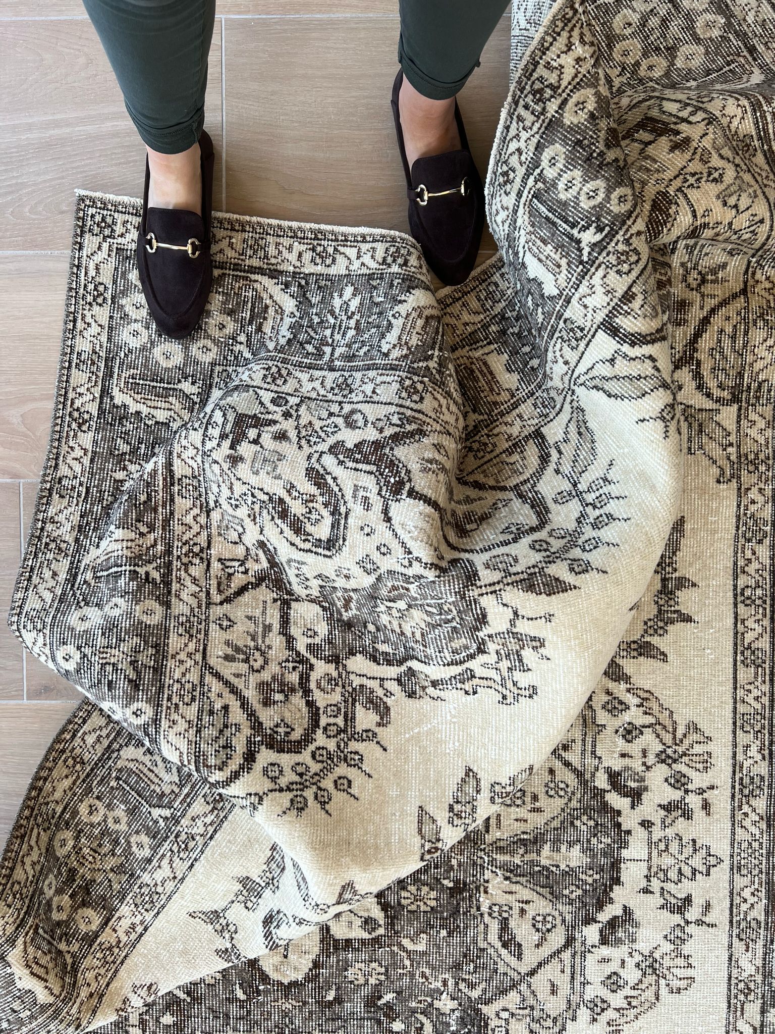 Vintage Turkish rug, antique wool rug, neutral area rug, central medallion rug, distressed Persian rug, farmhouse interior, timeless home decor, classic meets modern, Soho Farmhouse style, Amber Interiors, Studio McGee, rustic charm, luxury home styling.