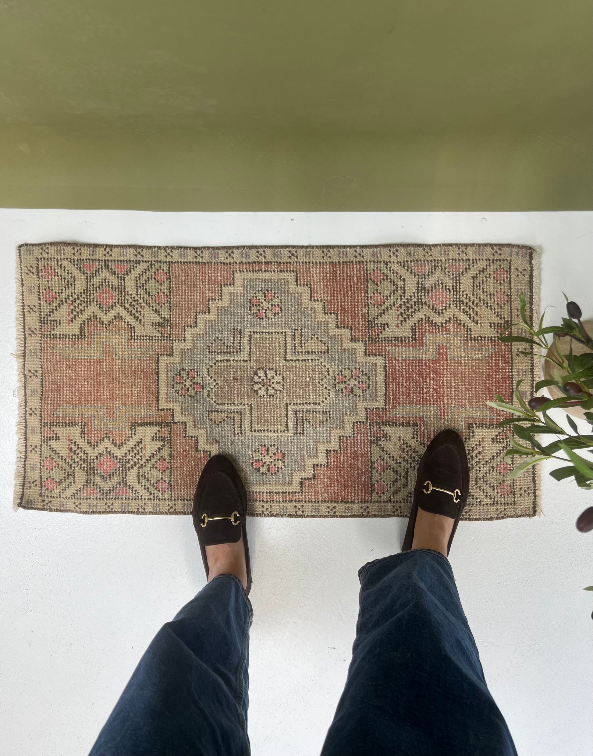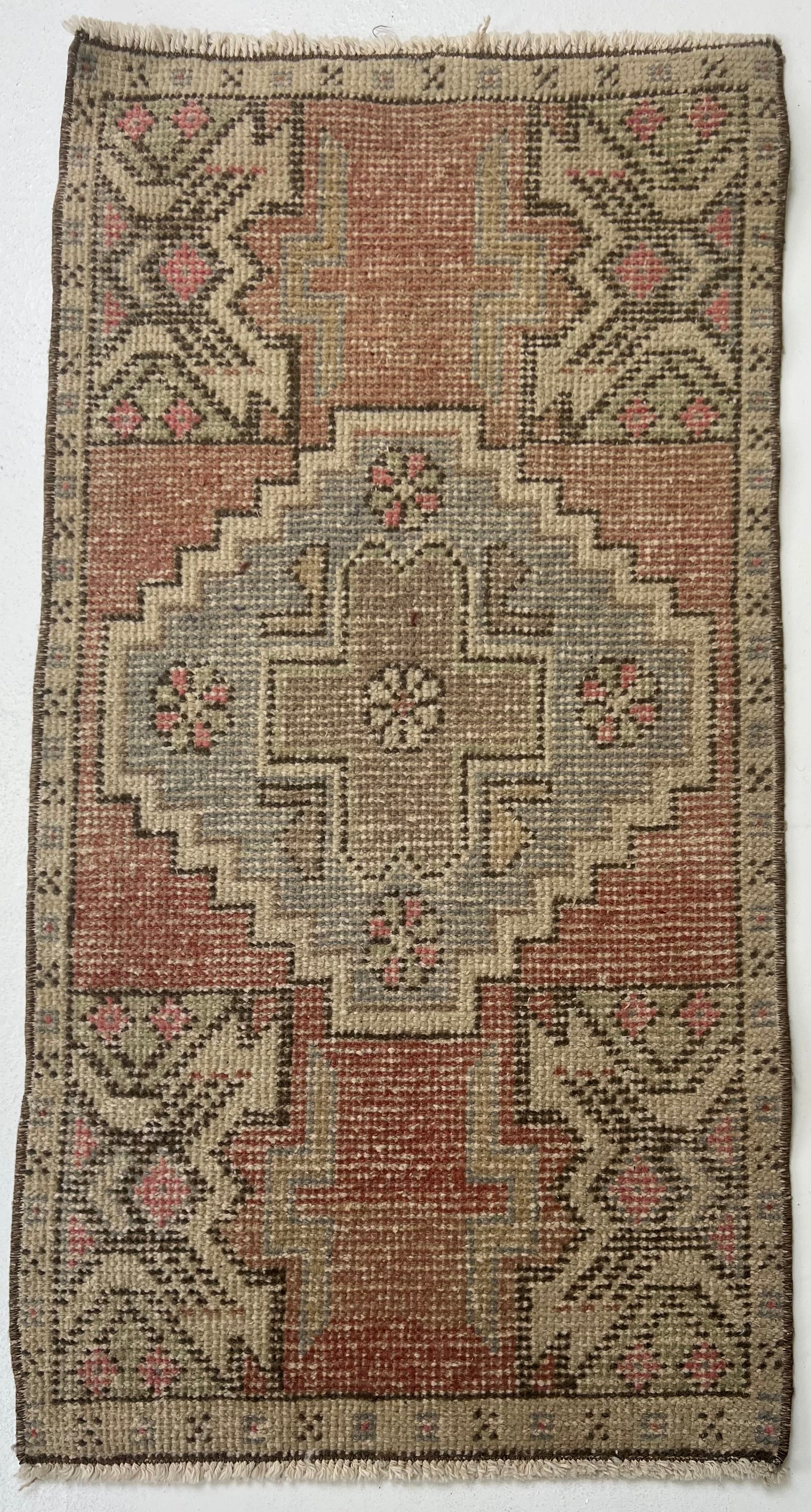 This is a one-of-a-kind, handmade vintage mini rug – only one available.