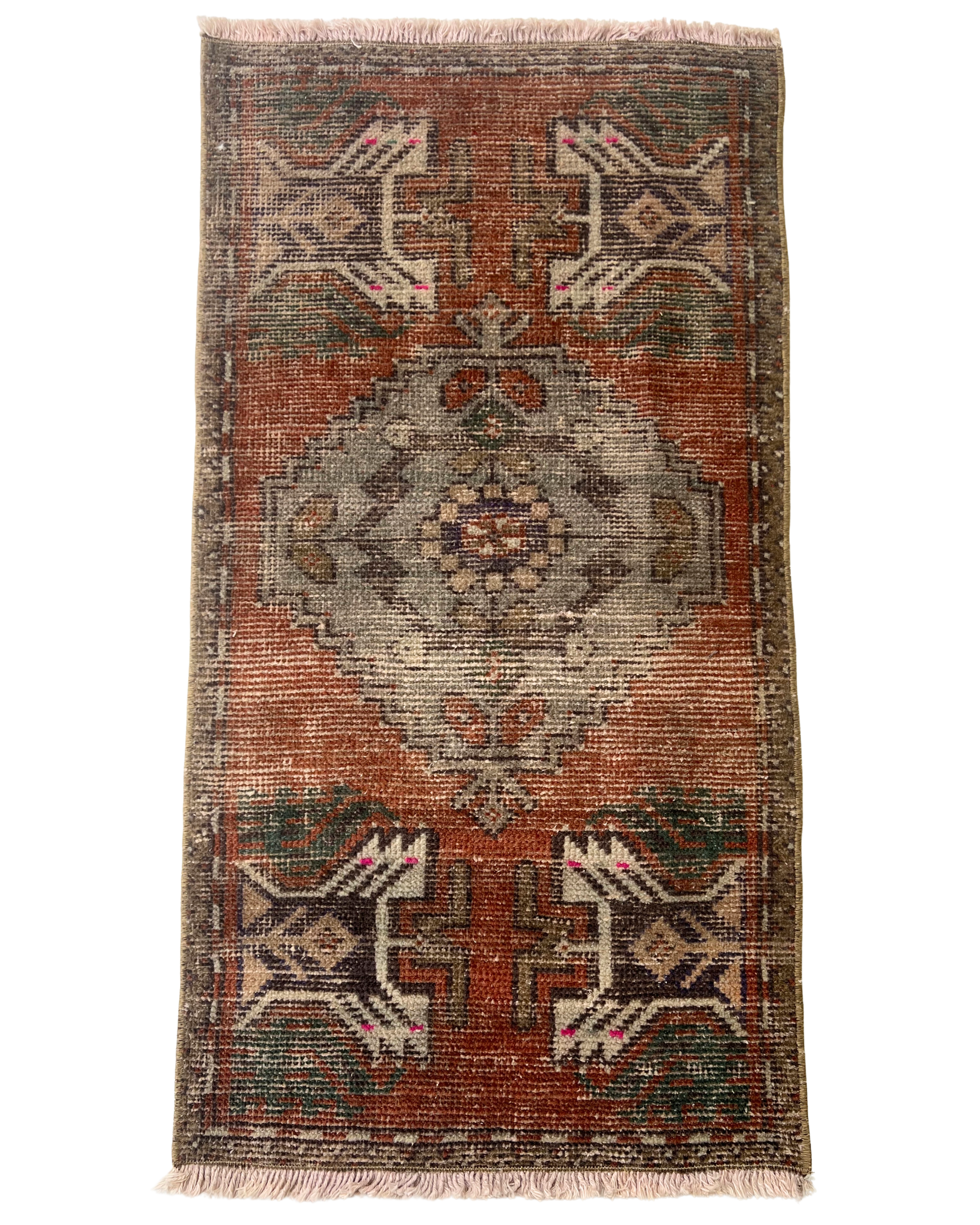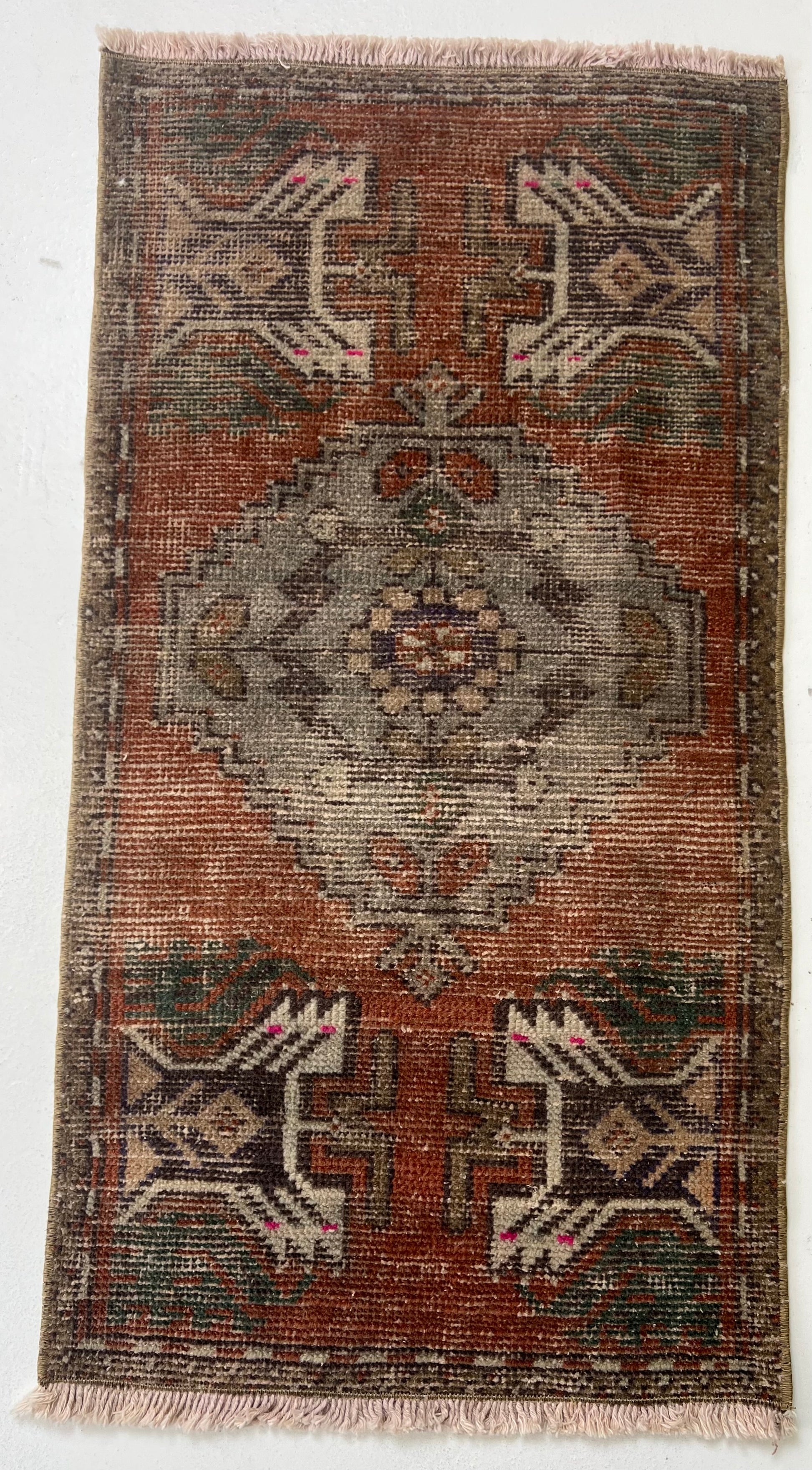 The Talia vintage mini rug is a richly detailed Turkish scatter rug featuring a softly defined geometric central medallion framed by bold tribal corner motifs. The deep terracotta field is beautifully contrasted with tones of muted sage green, charcoal, and soft ivory, while delicate hints of blush pink and faded blue add subtle vibrancy. The symmetrical layout creates a strong, balanced composition, while the naturally distressed finish softens the overall look, giving the rug a relaxed, timeworn character. Compact yet full of depth and texture, this piece is perfect for adding warmth and interest to smaller spaces.