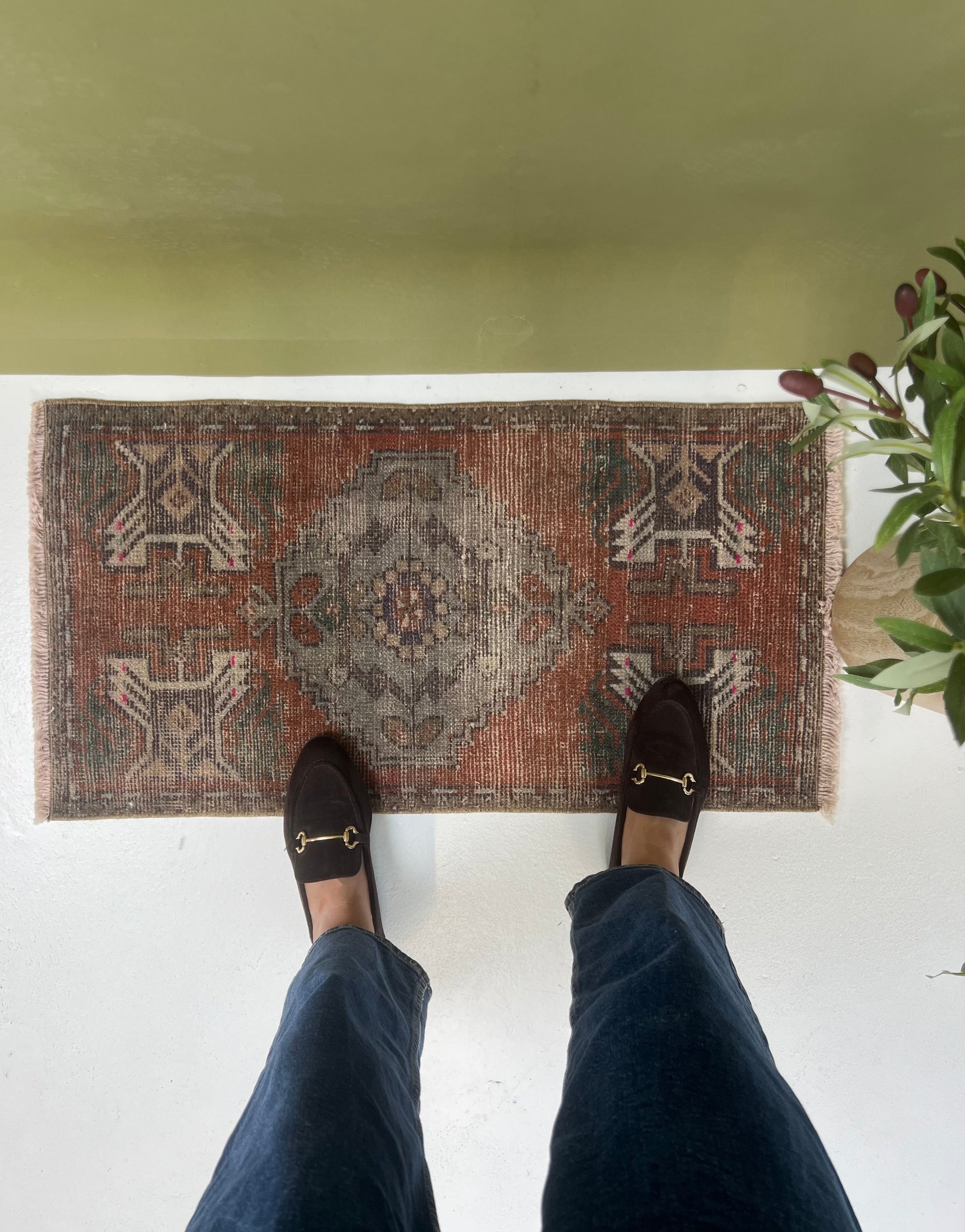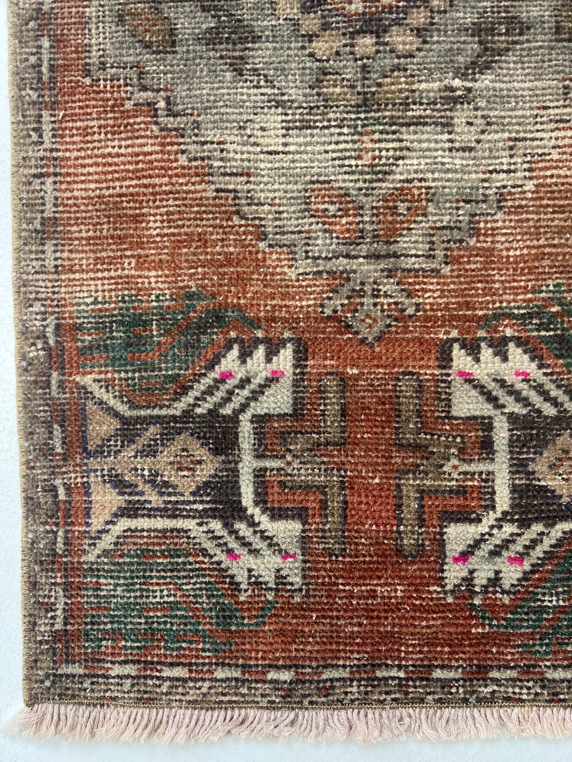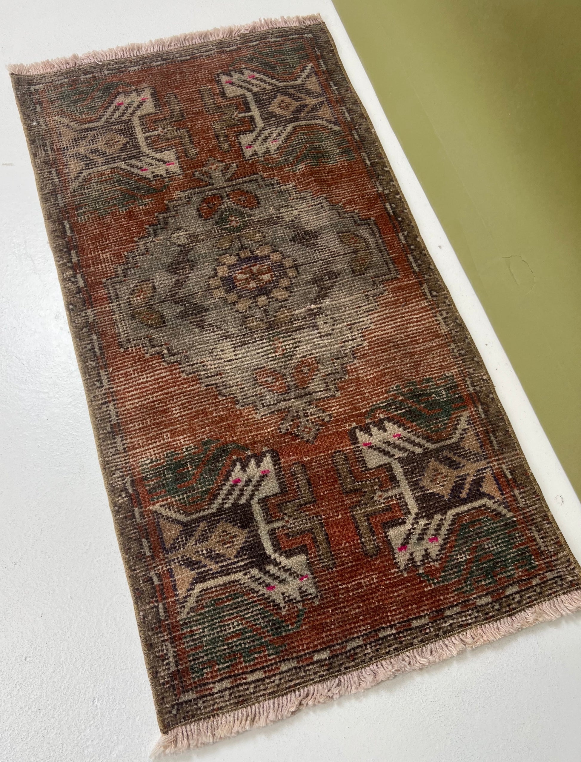 This is a one-of-a-kind, handmade vintage mini rug – only one available.