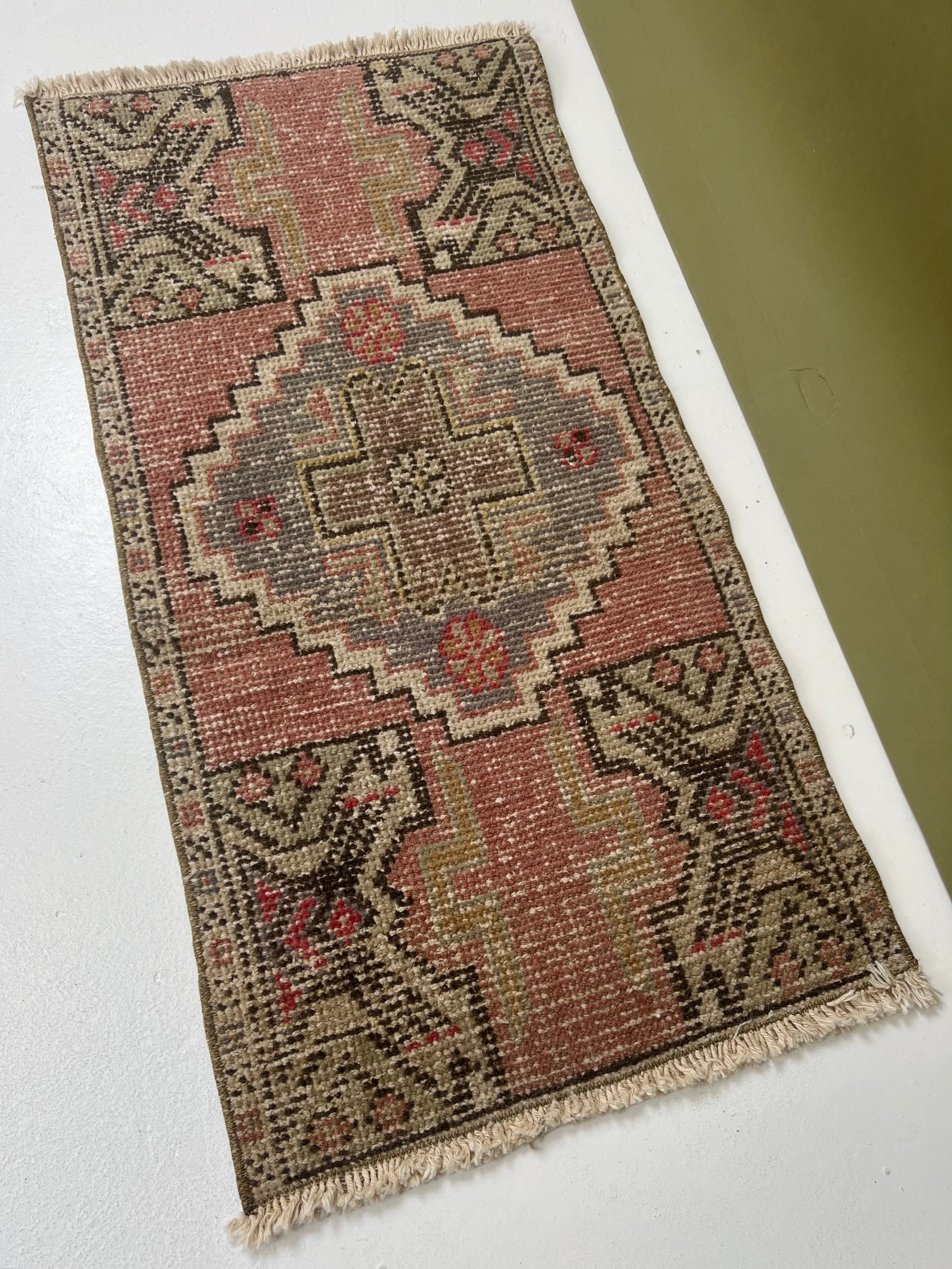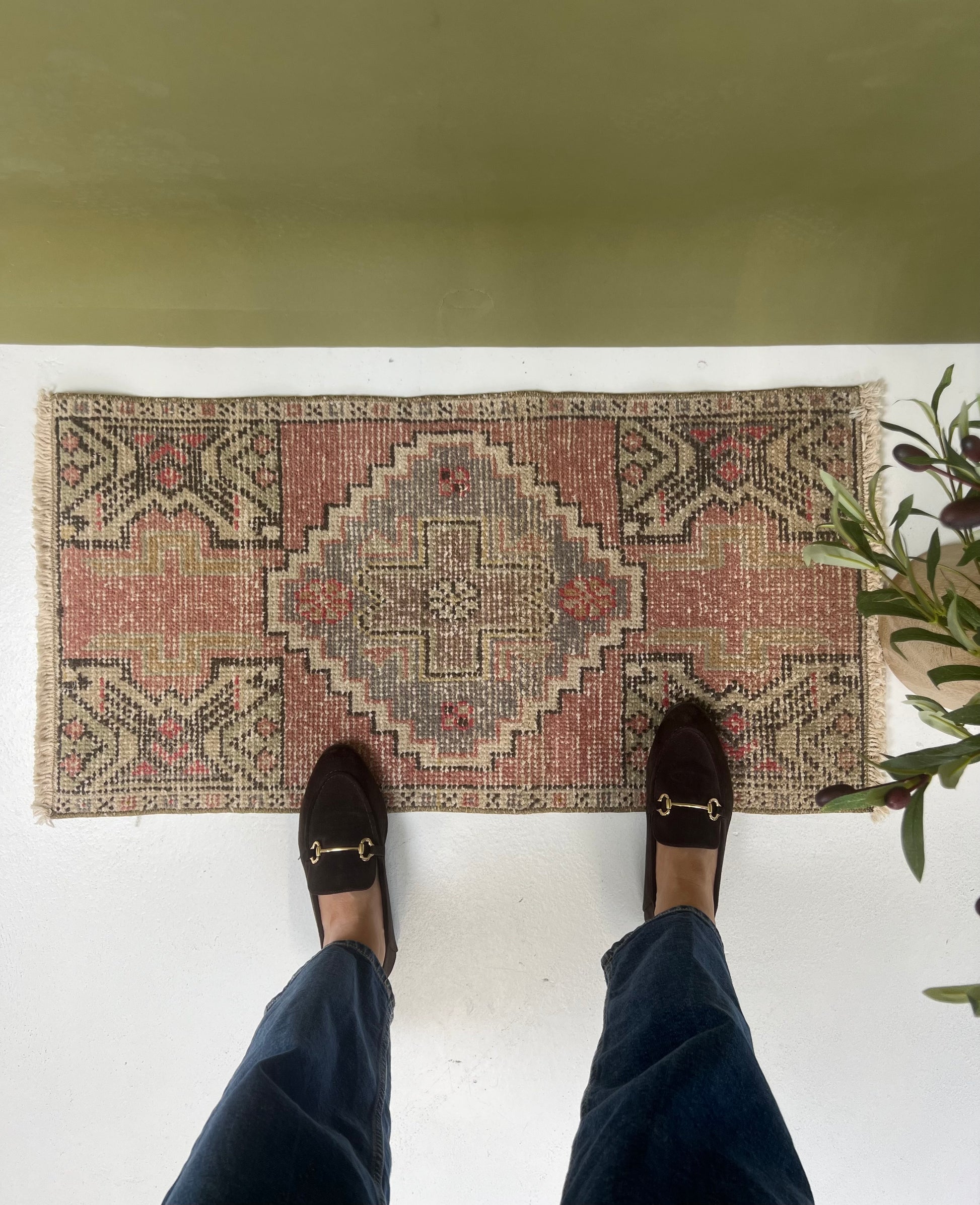 Mini vintage rug, Turkish scatter rug, tribal rug, geometric rug, dusty rose rug, small wool rug, boho decor, rustic interior, farmhouse style, layered home decor, wabi sabi home, organic modern decor, vintage Turkish rug, accent rug, Amber Interiors style, Studio McGee inspired, neutral vintage rug.